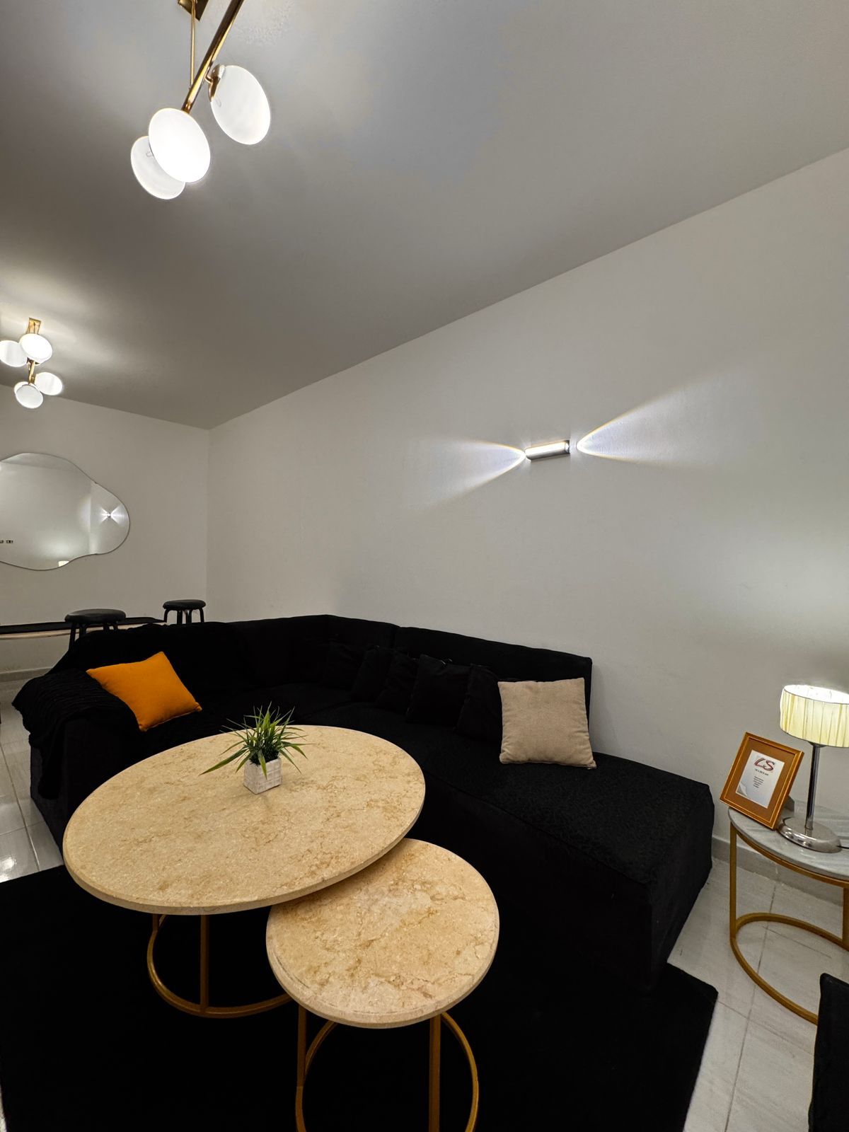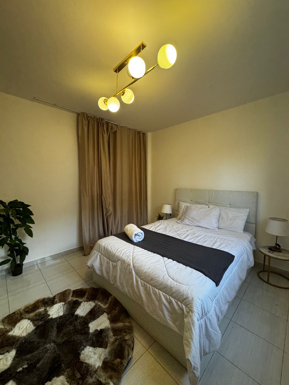 شقة في مدينتي بالمرحلة الثانية النموذج ( 100 ) المساحة 107 متر2 بحري و غربي تطل على باركنج تشمل 2 نوم 1 حمام 1 بلكونة بالطابق الثاني تشطيب الشركة للإيجار مفروش 25,000 جنيه و WiFi إنترنت فايبر \\n مكيفه air conditioner
