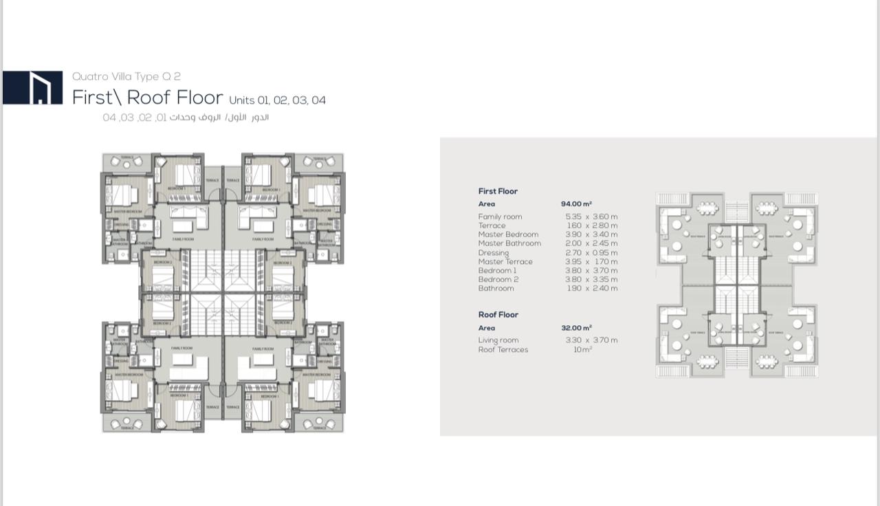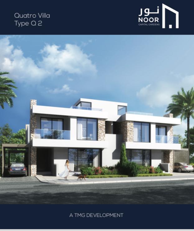 فيلا رباعية في نور بالمرحلة الرابعة النموذج ( Q2 ) المساحة 229 متر2 مساحة المباني 213 متر2 بحري و غربي تطل على شارع تشمل 3 نوم 3 حمام 3 بلكونة بدون تشطيب للبيع تقسيط على 10 سنة بمقدم 4,250,000 جنيه